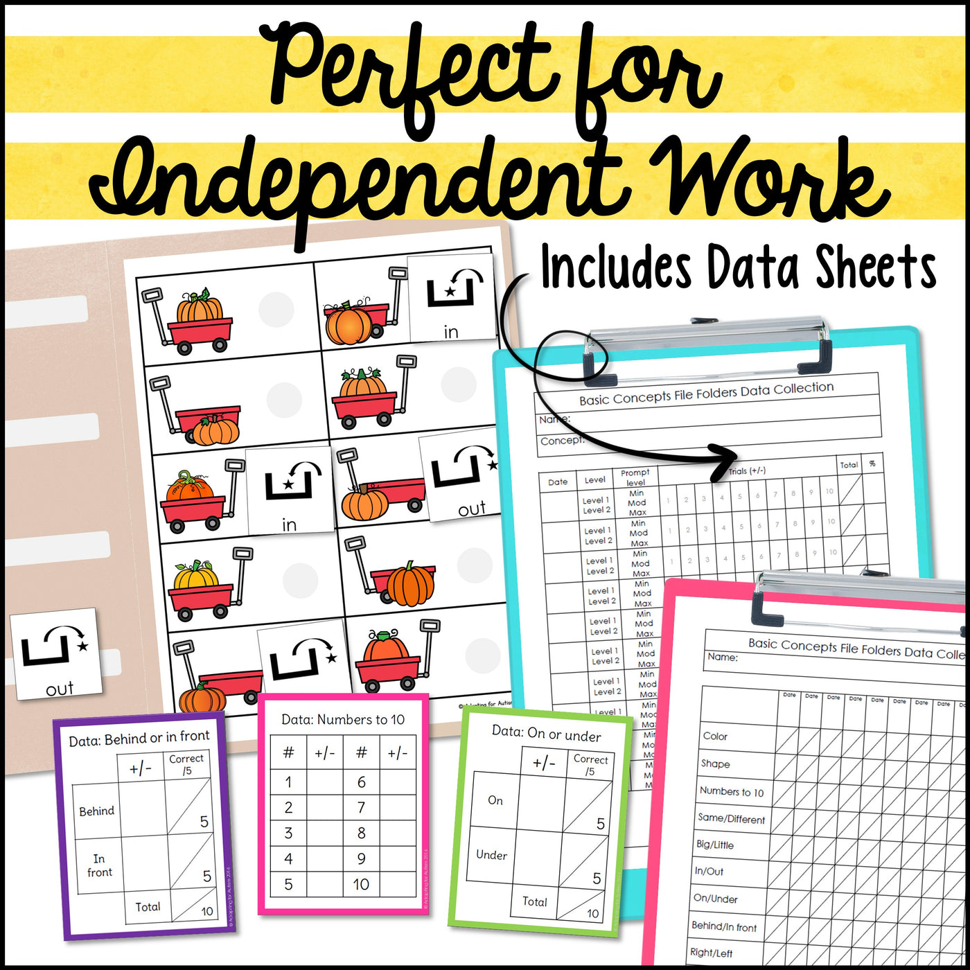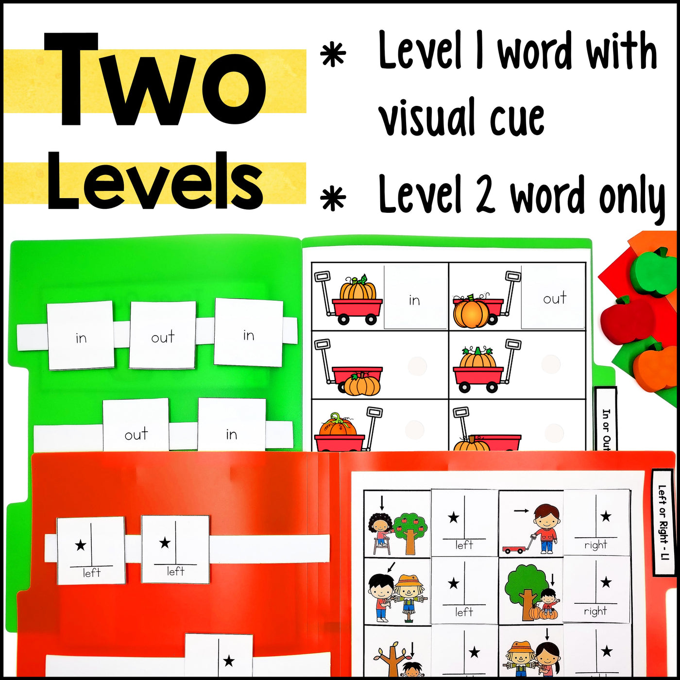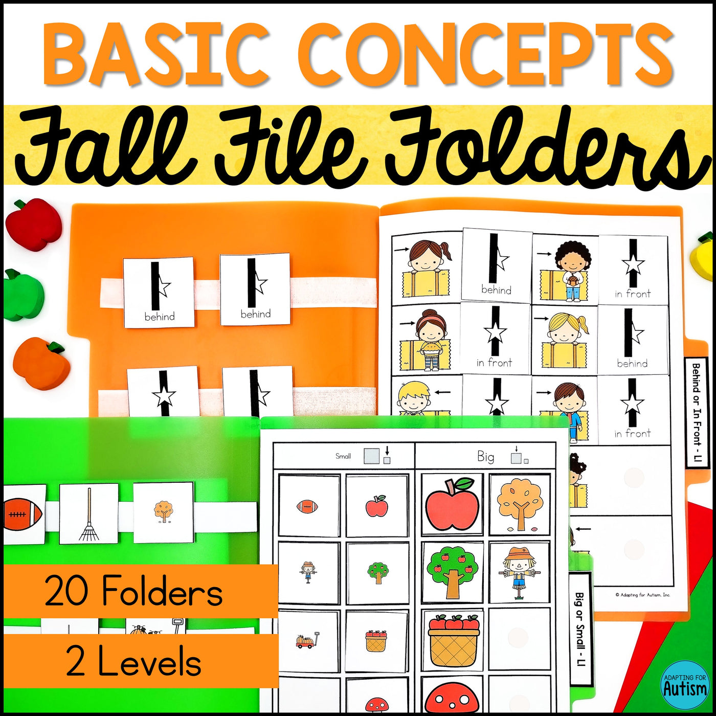 These apple and fall themed basic concepts file folder activities cover 10 different basic skills your special education students should be practicing every day! Each concept has 2 levels for a total of 20 file folder activities. Level 1 has a word and visual cue while level 2 only has the word.